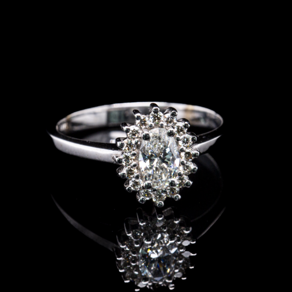 יהלום טבעי משובץ ברמת ניקיון VVS1 יושב במרכז הטבעת, מקנה לה ברק מופעל וזוהר ייחודי. צבעו הנטוי בין D ל-F מוסיף לו ניקיון וקרינה של חומרה.