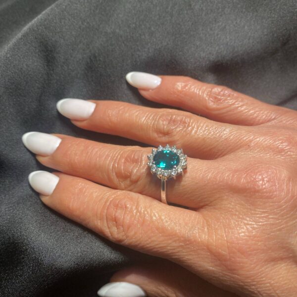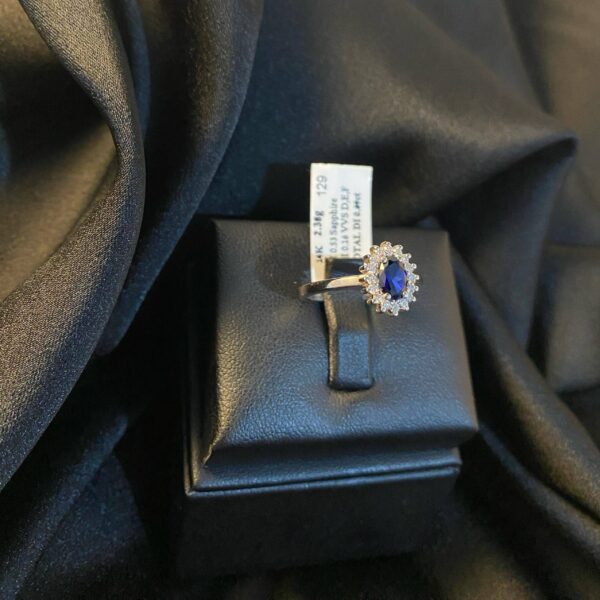 ברוכים הבאים לעולם היוקרה והסטייל, עם טבעת יהלום דיאנה בזהב לבן 14K, המיוחדת בתכשיטה מהממת שמביאה איתה את אלגנטיות היוקרה ויופי הטבע. הטבעת מצוידת בספיר כחול משובץ ושיבוץ מסביב של 16 אבנים מבריקות, ומגיעה עם תעודה גמולוגית IGL.