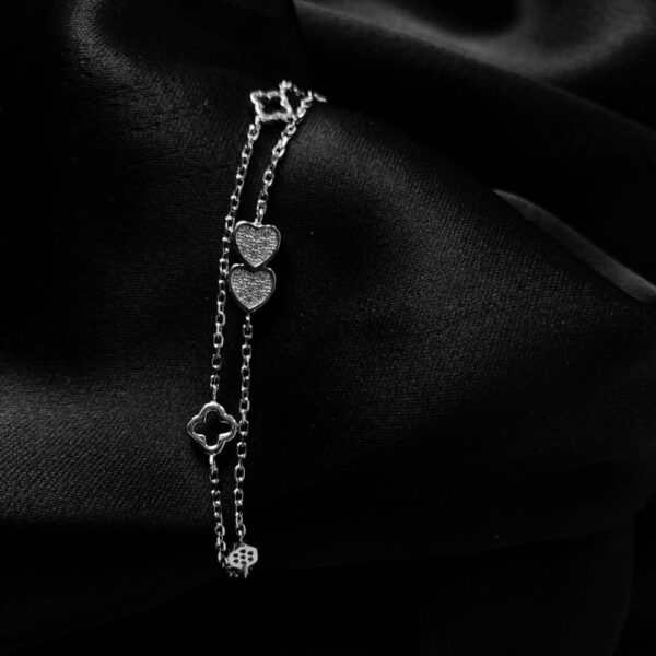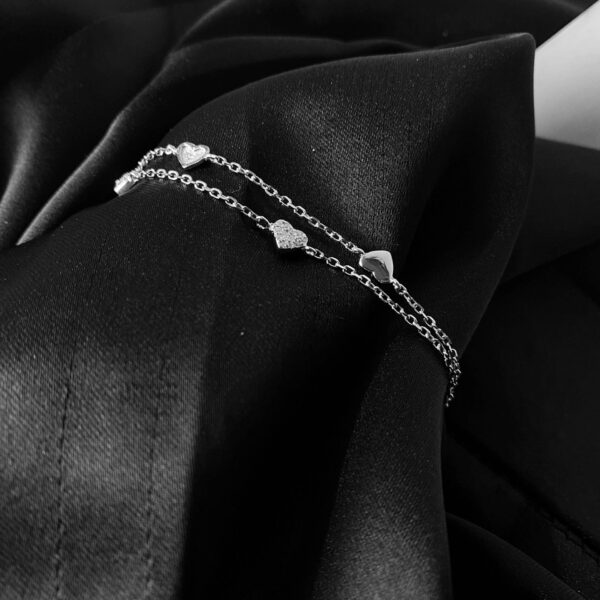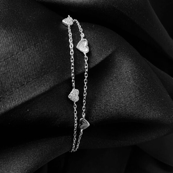 ברוכים הבאים לעולם היופי והאלגנטיות, עם צמיד דאבל לבבות מכסף טהור 925 המוסיף קסם יומיומי ויוקרה לכל לוק. הצמיד מעוטר בשני לבבות שבהן משובצים זרקונים בחיתוך לייזר, נותן לו מראה של שני צמידים במראה אחד.